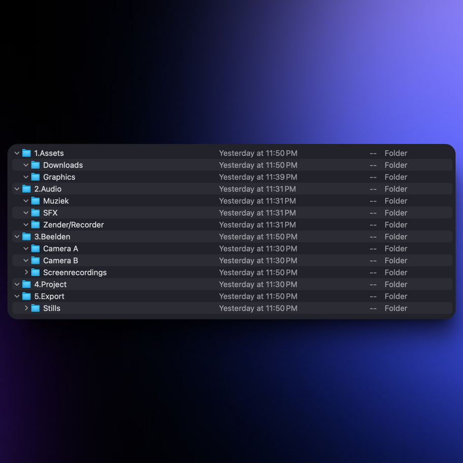Organiseer je videoprojecten als een pro met de Leren Editen Mappenstructuur! Deze mappenstructuur helpt je om al je bestanden overzichtelijk te bewaren, van ruwe beelden en audio tot grafische elementen en exports. Perfect voor beginners en gevorderde editors die hun workflow efficiënt en gestructureerd willen houden. Download nu en breng je videoprojecten naar een hoger niveau! 🎬✨